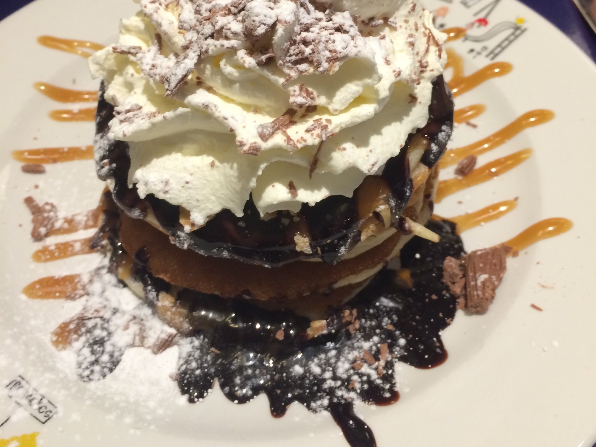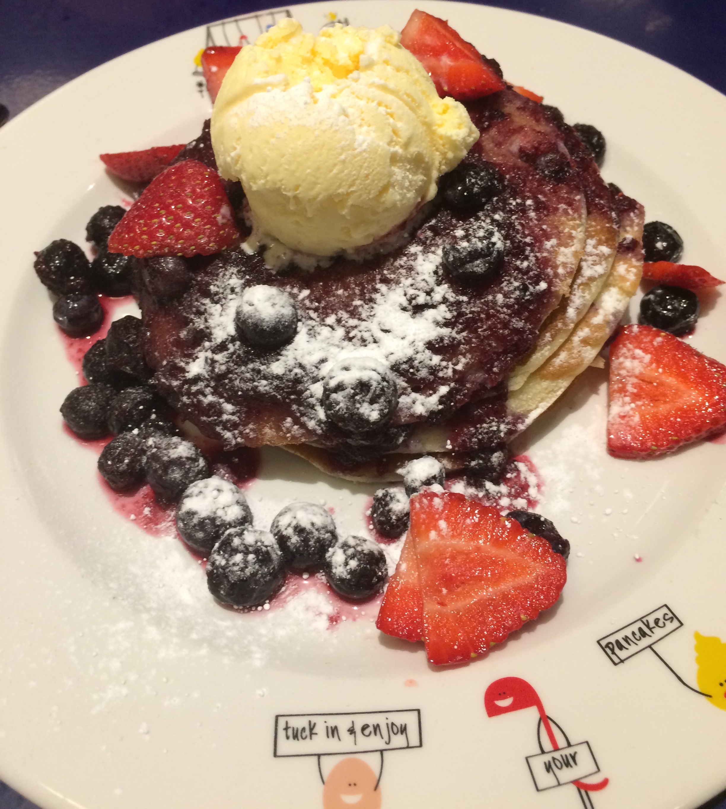 I had the cheese and mushroom pancake with garlic butter and cheese (£7.15 for a small), it was lovely but could have done with a little more garlic butter. Then the desserts! We shared two between three, the banoffee stack at £7.95 and the blueberry delight (£8.15 and added strawberries for £1.05). The blueberry stack was a teeny bit disappointing. I love blueberries and so eat tonnes of them both fresh and frozen for when I’m in a rush and can’t be bothered picking through them to wash and check for mouldy bottoms (I never used to do this and now I wonder how many mouldy ones I have eaten in my time). The frozen ones always have a tougher skin and the blueberries in the compote had obviously been frozen at some point, but in this kind of establishment I guess that is to be expected. The compote needed to be slightly sweeter and the strawberries were an expensive add on for the amount we got. The banoffee stack was lovely, not too sweet and just the right amount of pancake, cream, sauce and banana. Yum!