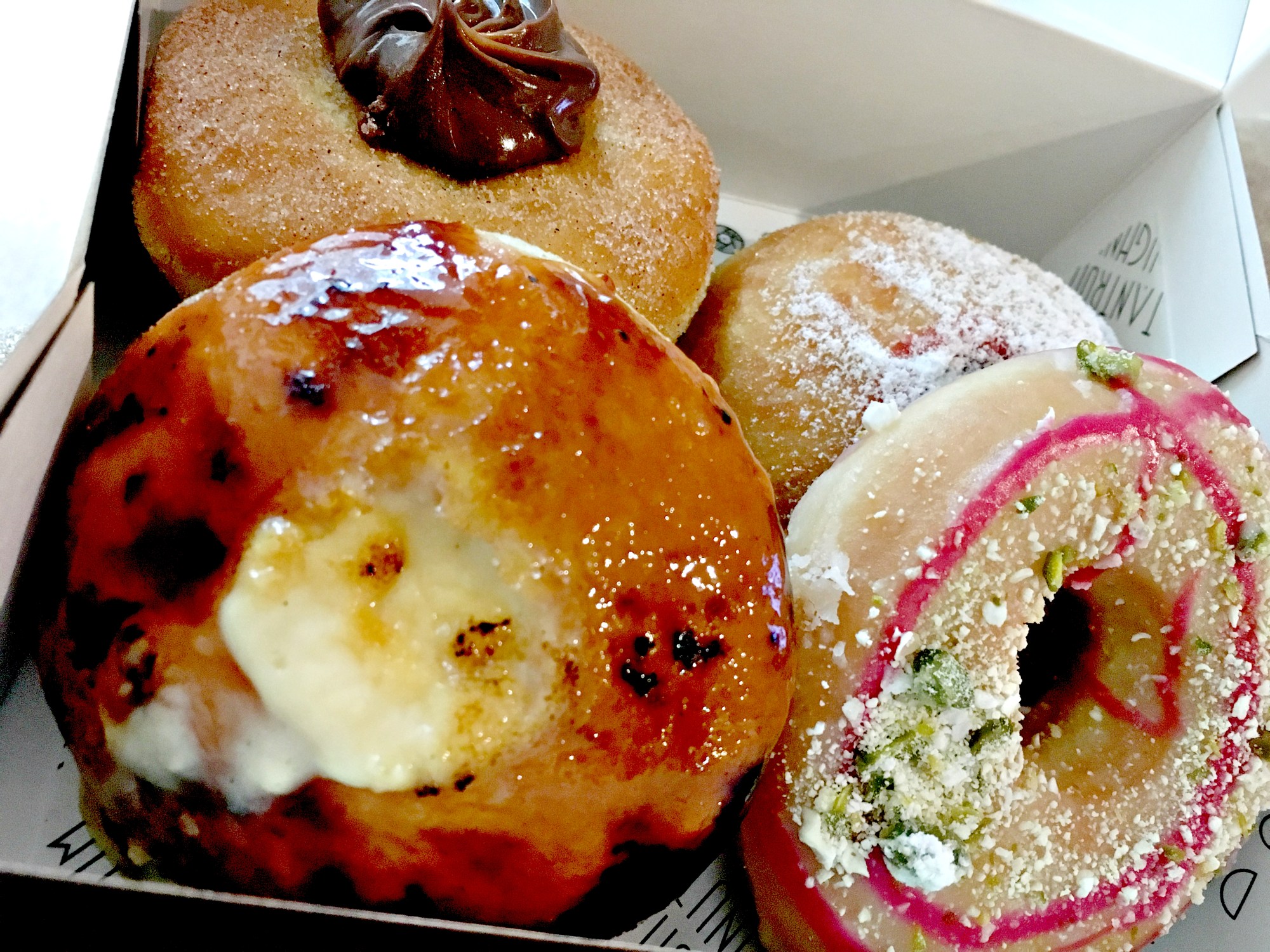 Now on to the big guns. The filled doughnuts. I tried both of the creme brûlée offerings. There was normal and pistachio. Now the standard creme brûlée was yummy, but was little too brûlée for me. I am being a little harsh cos it was lovely with the crisp caramel sugar topping and the creamy custard it was gorgeous but I’m only saying that to compare it to the pistachio one. The pistachio custard was something to behold! Loved it! LOVED.