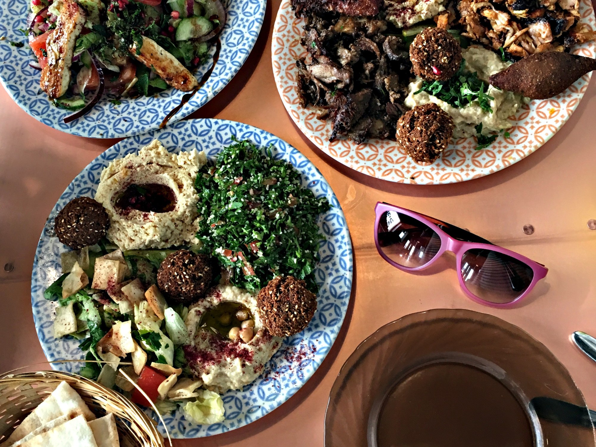 The vegetarian Mezze platter had hummus, baba ghannoush, tabbouleh, falafel, fattoush salad, manakeesh jibneh, again served with pickles & homemade bread. This plate looked awesome. In retrospect our plate didn’t seem to have any manakeesh jibneh but I didn’t notice this at the time. Not that we needed more food. The tabbouleh was particularly nice and I scoffed more than my fair share of this. Fresh and minty with citrus. Yum.